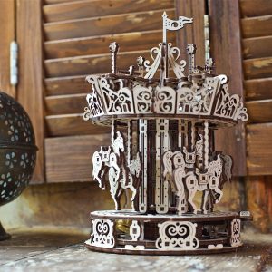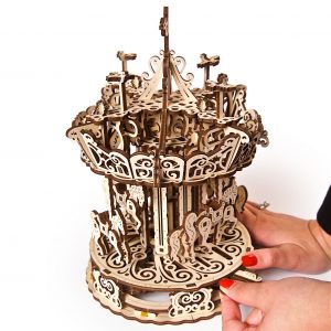 Този забележителен модел е погледът на Ugears към класическия карусел (панаирджийска въртележка), реализирана в дърво с топ качество и познатата и обичана панаирджийска атракция е представена със силно подробен дизайн. Тук ще намерите два вида карусел кончета, които се клатят нагоре-надолу, докато моделът се върти. В сърцето на модела е централният стълб, който върти в посока, обратна на основната платформа, правейки го да изглежда сякаш въртележката се върти по-бързо отколкото наистина го прави и създава очарователната динамика на цялостна конструкция. Стълбът се издига над покрива, правейки го визуално по-деликатен и в същото време, придаващ му повече обем. Добавете малките птички, реещи се над покрива на въртележката, заедно с декоративни, летящи фенери и може да усетите аромата на хотдози и захарен памук!