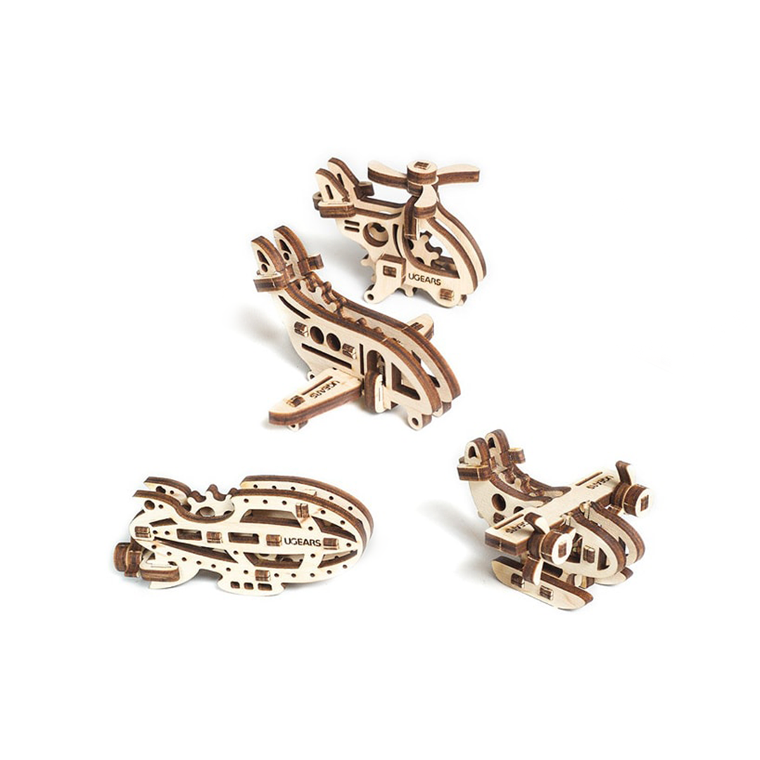 Setul unic de 4 modele miniaturale individuale pentru auto-asamblare pentru adulți și copii de la 5 la 80 de ani și peste. Setul include elicopter, hidroavion, dirijabil, avion cu elemente mecanice de bază.